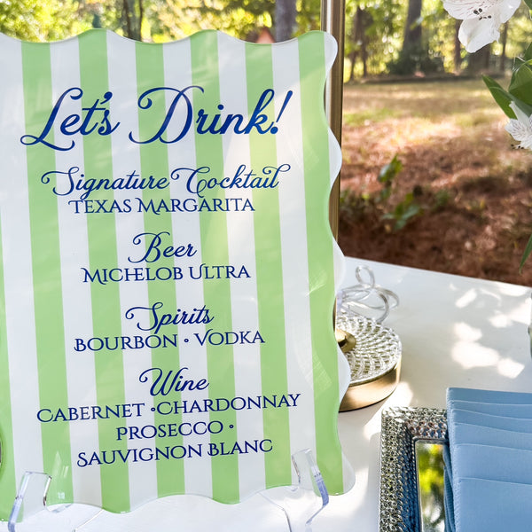 This acrylic bar sign brings the fun with bold navy script and playful green stripes — because your drink menu deserves to stand out! Perfect for outdoor celebrations, it’s equal parts stylish and practical, letting guests know what’s on tap while adding a pop of personality to the bar.
