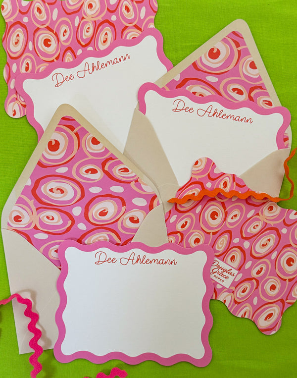 This custom stationery suite brings bold personality to refined design. Featuring a lively swirl pattern in shades of pink and coral, paired with a crisp die-cut edge and personalized name detail, it’s a statement piece for correspondence that feels as joyful as it is sophisticated.
