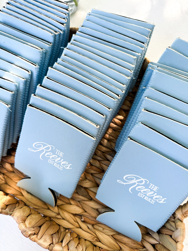 These custom powder-blue koozies offer a sophisticated touch to a celebratory favorite. Personalized with the couple’s name and wedding date, they combine practicality with polished design — a keepsake that guests will cherish long after the last toast.