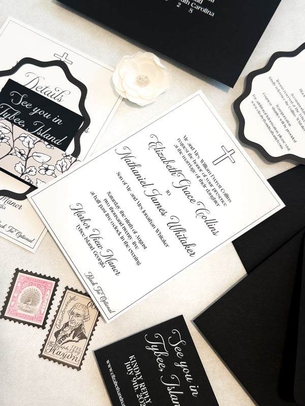 This suite is all about timeless elegance with a twist. Crisp black and white tones meet playful die-cut shapes and floral accents for a look that’s equal parts formal and fun. From the main invitation to the cheeky “See you in Tybee Island” detail card, every piece whispers sophistication while winking at personality.