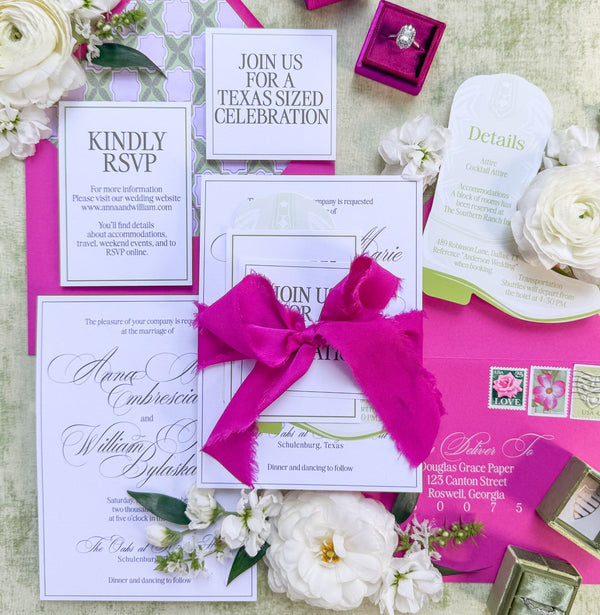 This invitation suite brings a modern twist to classic elegance with crisp typography, structured layouts, and a vivid pop of fuchsia silk ribbon. Paired with floral accents and coordinating detail cards, it’s a statement-making design that celebrates personality while honoring tradition.
