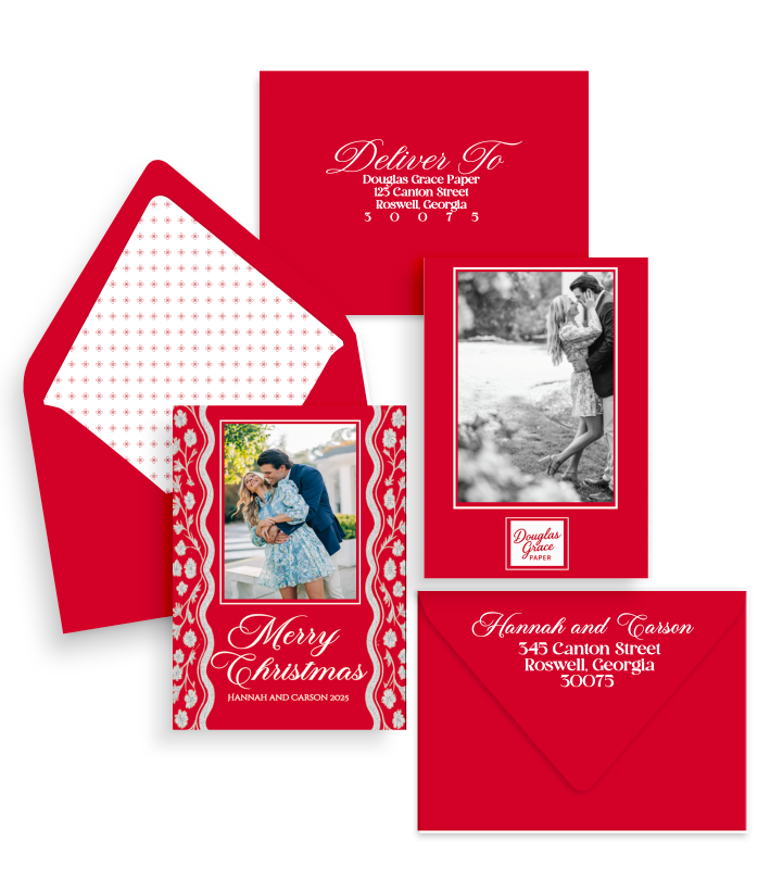 If you purchase return + recipient addressing, a form will be sent with your confirmation email for you to type your addresses. This form must be completed and emailed back to douglasgracepaper@gmail.com in order for your envelopes to be printed.