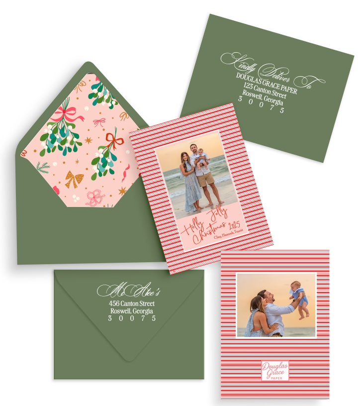 Send cheerful holiday wishes with our Holly Jolly Christmas Card, featuring festive red-and-white stripes and your favorite photo front and center. Paired with a whimsical mistletoe liner and green envelopes, this design is full of holiday charm — perfect for spreading joy to family and friends.
