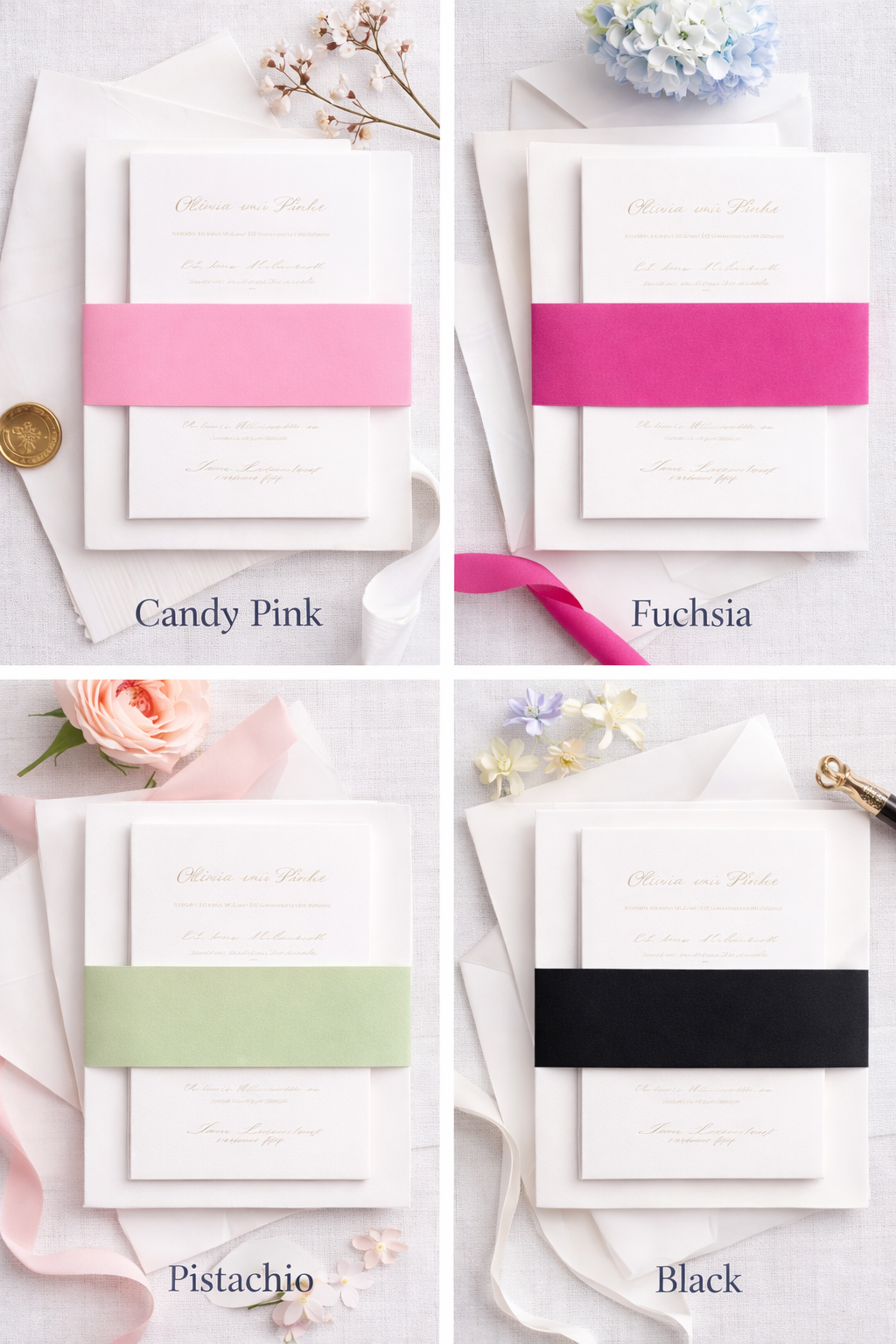 Available in a curated selection of hues, each belly band is professionally cut for a clean, tailored fit and pairs seamlessly with both semi-custom and custom invitation suites.