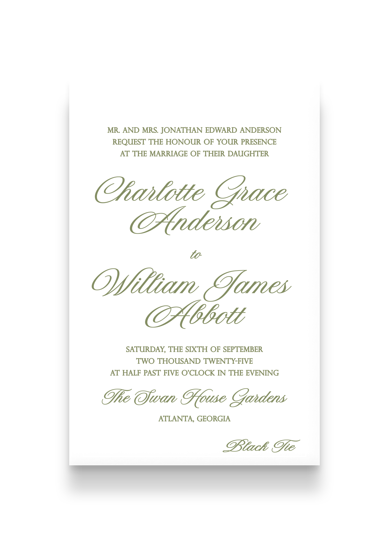 Our Semi-Custom Invitation Suites are designed to be effortlessly buildable. Begin with a named design, then customize your envelope color, wording style, font color, card layouts, printing method, and optional embellishments. Each selection is thoughtfully curated to layer beautifully—so your final suite feels personal, cohesive, and refined.