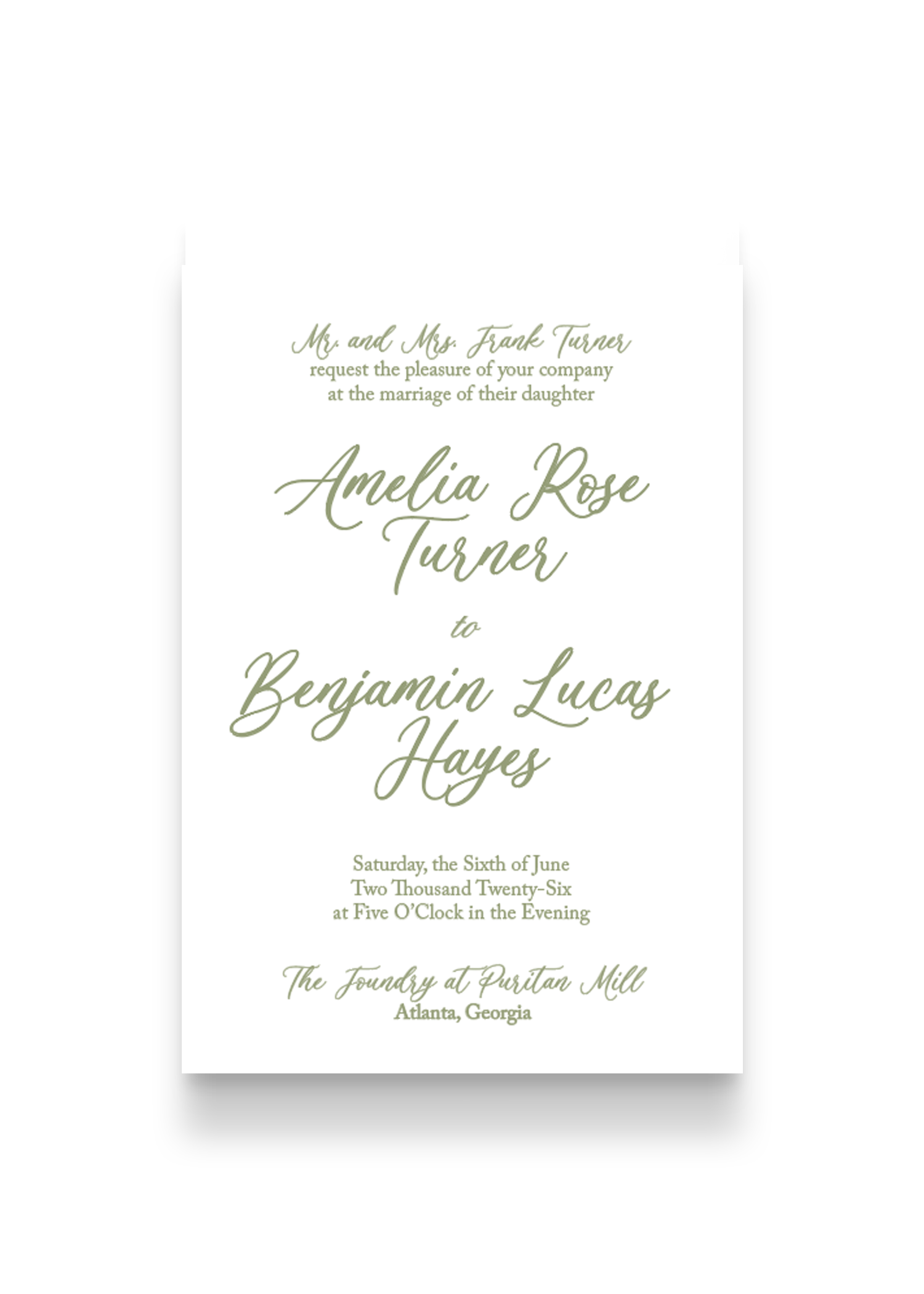 Our Semi-Custom Invitation Suites are designed to be effortlessly buildable. Begin with a named design, then customize your envelope color, wording style, font color, card layouts, printing method, and optional embellishments. Each selection is thoughtfully curated to layer beautifully—so your final suite feels personal, cohesive, and refined.